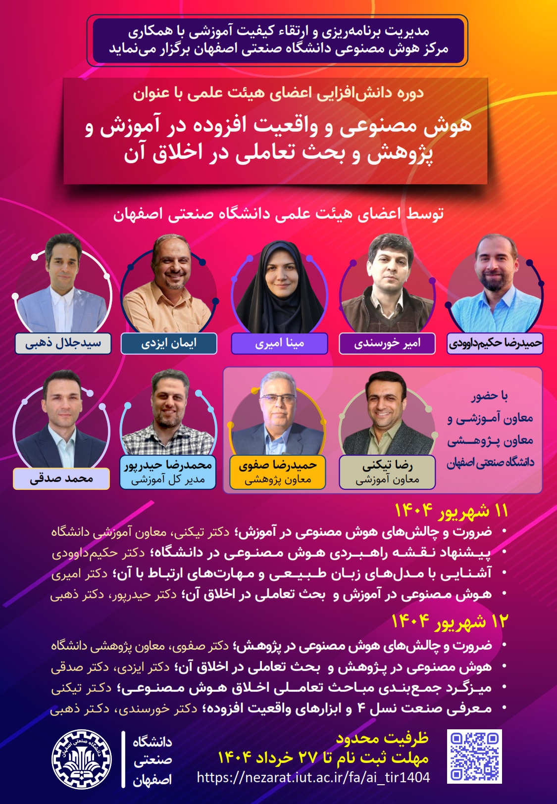 این دوره با هدف آشنایی اعضای هیئت علمی با مفاهیم بنیادین، فرصتها و چالشهای هوش مصنوعی و واقعیت افزوده در عرصههای آموزش و پژوهش برگزار میشود. تمرکز بر درک کاربردهای نوین این فناوریها، شناخت ابزارهای مرتبط، توسعه مهارتهای ارتباط با مدلهای زبانی، و بررسی ابعاد اخلاقی استفاده از هوش مصنوعی از دیگر اهداف کلیدی این برنامه است. همچنین در این دوره، راهکارها و نقشههای راهبردی برای بهرهمندی مسئولانه و مؤثر از فناوریهای نوین در محیط دانشگاهی مورد بحث و تبادل نظر قرار خواهد گرفت.